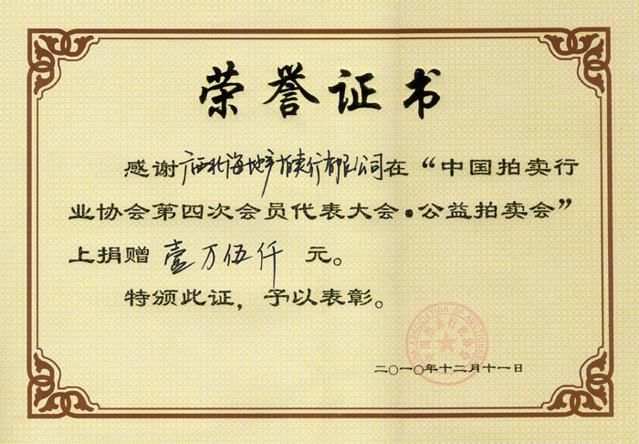 2010年12月11日“中国拍卖行业协会第四次会员代表大会.公益拍卖”荣誉证书