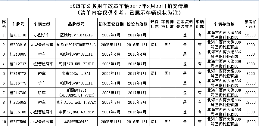 受委托,我公司将于2017年3月22日(星期三)上午9:00时在北海市重庆路189号止泊园精品酒店3楼会议室举行拍卖会,公开拍卖公务用车制度改革处置车辆一批,按辆分别拍卖。竞买保证金:5000元/辆。