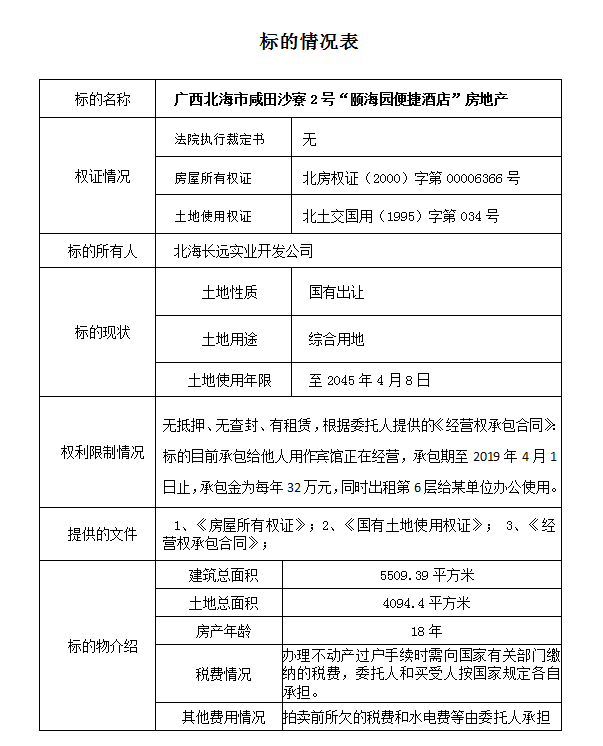 一、拍卖标的:位于北海市咸田沙寮2号“颐海园便捷酒店”房地产。土地参考面积 :4094.4平方米,出让综合用地,建筑参考面积:5509.39平方米,钢混7层。参考价:2310万元。