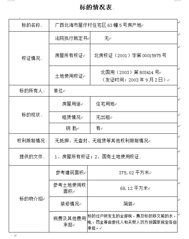 受委托,我公司将在阿里拍卖资产处置平台上(网址:http://zc.paimai.taobao.com)举行网络拍卖会,公开拍卖:北海市屋仔村住宅区63幢5号房地产。房产证号:北房权证(2001)字第00015975号,参考建筑面积:375.02平方米;土地证号:北国用(2003)第803414号,参考土地使用权面积:68.12平方米,使用期限至2073年8月。参考价96.2万元。竞买保证金:10万元。过户税费由买卖双方按国家规定各自承担。