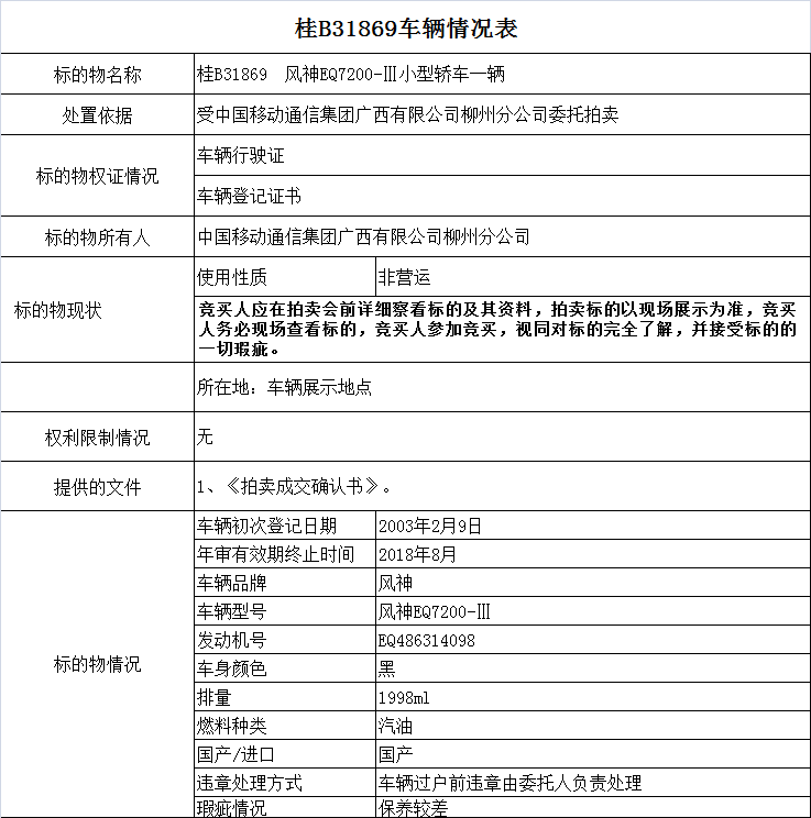 受委托,我公司将在阿里拍卖资产平台上(网址:http://zc.paimai.taobao.com)举行拍卖活动,公开拍卖桂B31869小型轿车一辆(柳州)。竞买保证金:5000元(拍卖结束前均可交保,拍卖成交后自动转为过户时效保证金)。具体如下:
