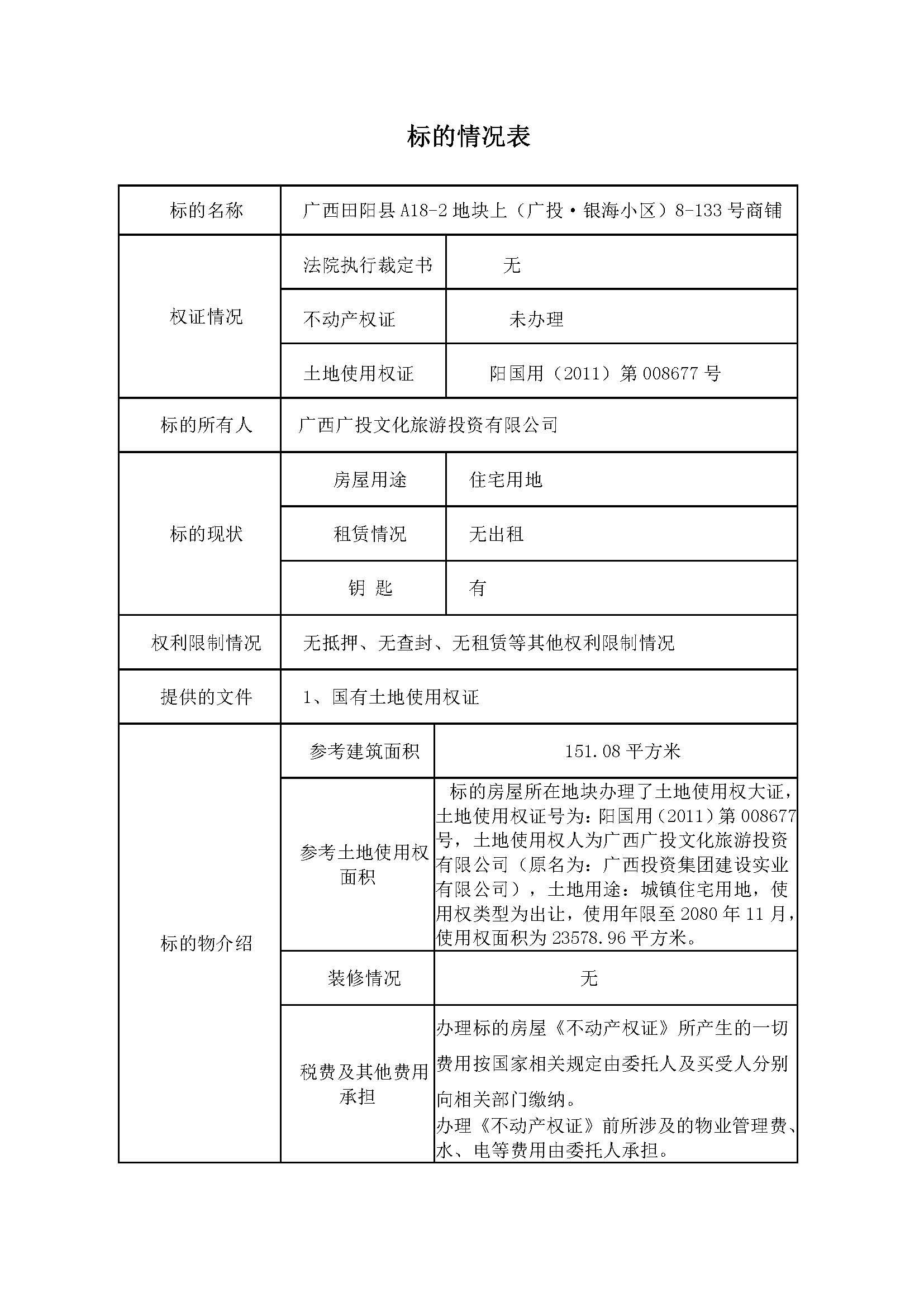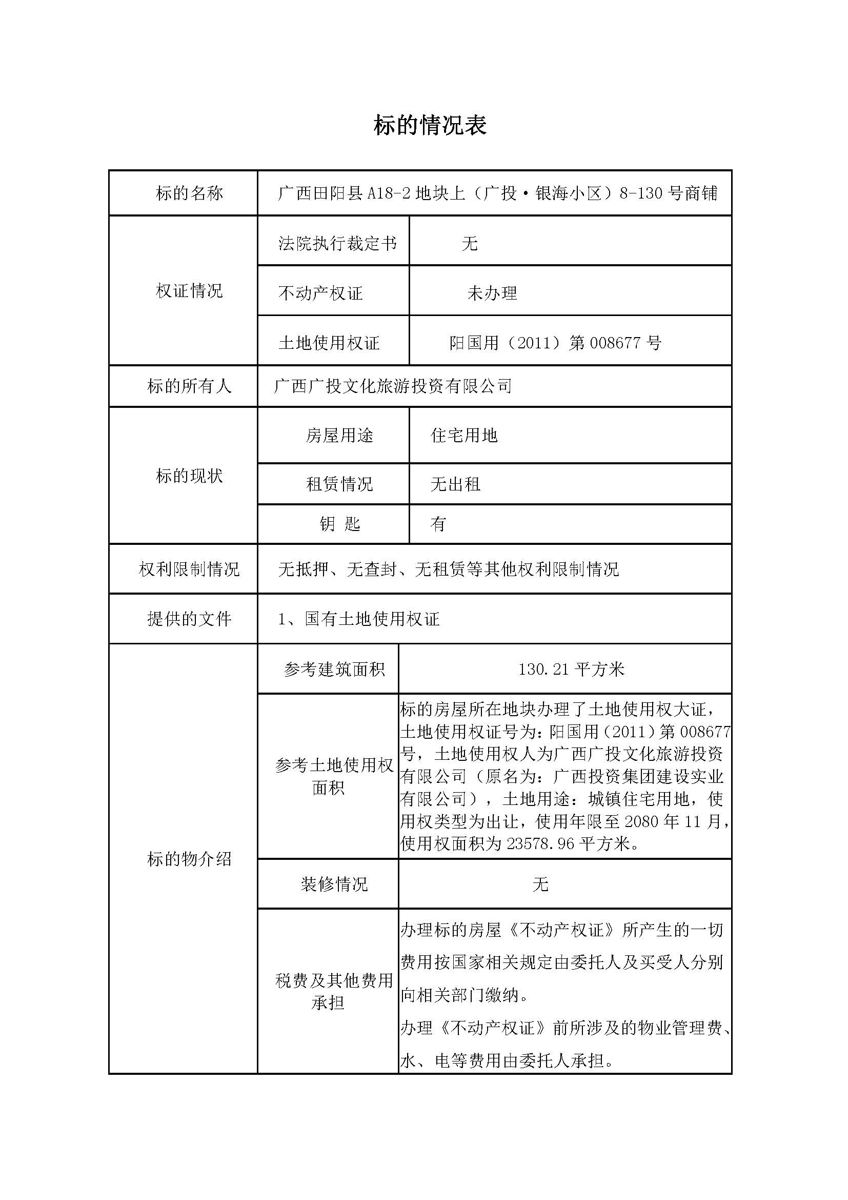 受委托,我公司将在阿里拍卖资产处置平台上(网址:http://zc.paimai.taobao.com)举行网络拍卖会,公开拍卖:广西田阳县田州镇隆平大道开发区A18-2地块上(广西百色银海发电有限公司田阳生活区,即广投·银海小区)8-130号、8-133号两间商铺房屋,按商铺单独拍卖。其中,8-130号商铺建筑面积为130.21平方米,参考价65.9万元。8-133号商铺建筑面积为151.08平方米,参考价74.2万元。