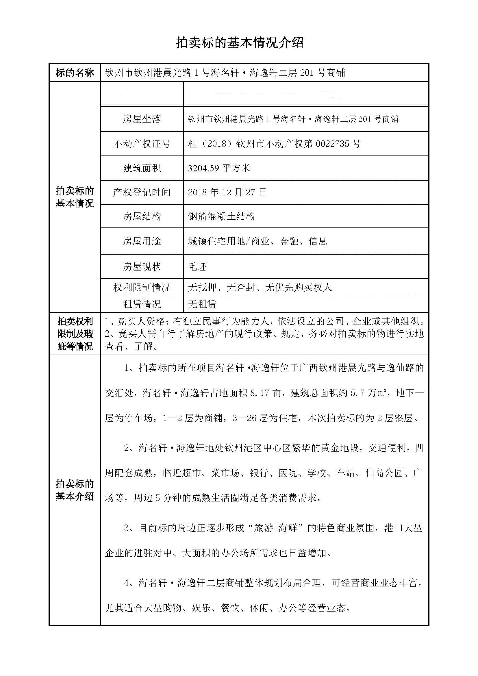 一、拍卖标的:钦州市钦州港晨光路1号海名轩·海逸轩二层201号商铺房产,参考房屋产权建筑面积3204.59平方米,参考价:1380万元。