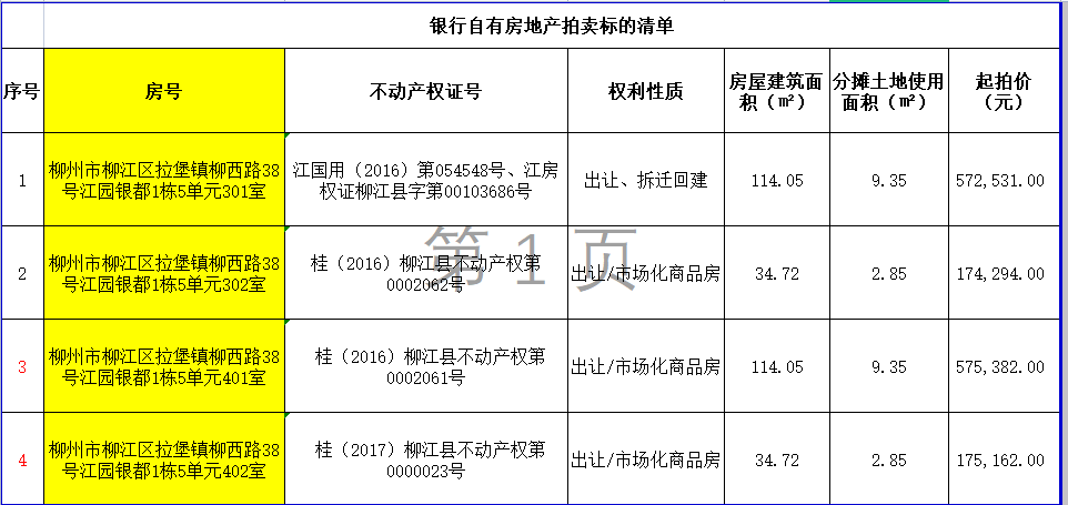 柳州市柳江区拉堡镇柳西路38号江园银都1栋5单元共4套中国农业发展银行柳江县支行自有房产,按套分别拍卖,竞买保证金:5万元/套。