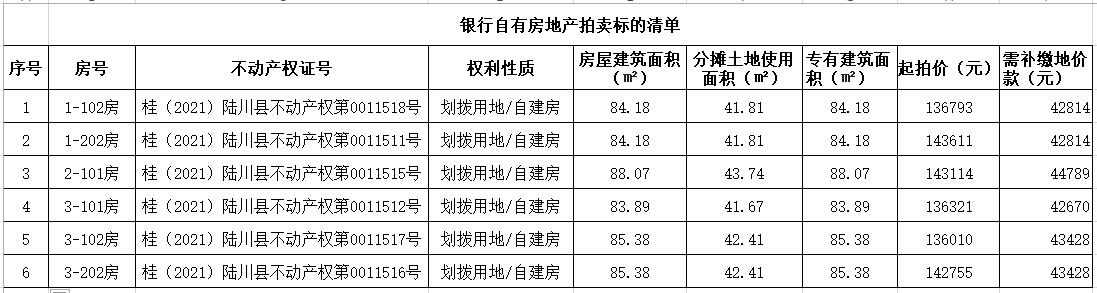 一、拍卖标的:玉林市陆川县温泉镇西滨北路93号(中国农业发展银行陆川县支行)宿舍楼共6套房地产,按套分别拍卖,竞买保证金:5万元/套。标的土地性质为划拨用地,过户需要补交缴的划拨用地地价款(出让金)由买受人负责承担,其他过户税费由委托人及买受人按国家相关规定各自承担。标的基本如下: