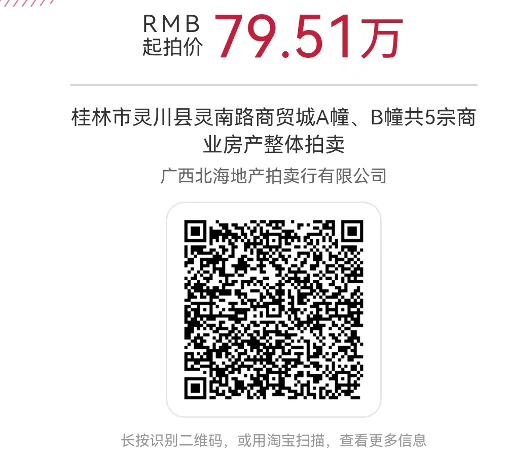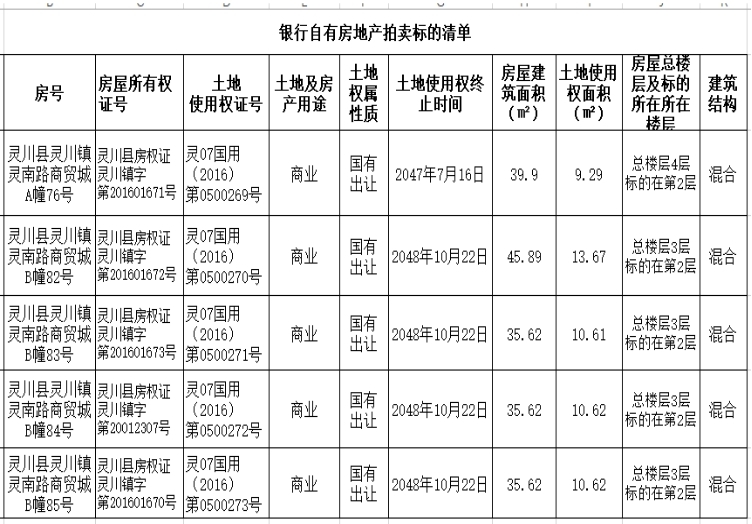 桂林市灵川县灵川镇灵南路商贸城A幢、B幢中国农业发展银行灵川县支行拥有的共5宗房地产,整体拍卖,详见以下标的清单。起拍价:795100元,竞买保证金:10万元。