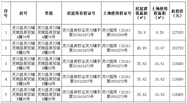 一、拍卖标的:桂林市灵川县灵川镇灵南路商贸城A幢、B幢中国农业发展银行灵川县支行拥有的共5宗房地产,按套分别拍卖,详见以下标的清单。竞买保证金:5万元/套。
