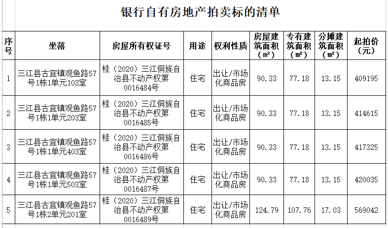 一、拍卖标的:柳州市三江县古宜镇观鱼路57号中国农业发展银行三江侗族自治县支行拥有的共5套房产,按套分别拍卖,详见以下标的清单,竞买保证金:5万元/套。