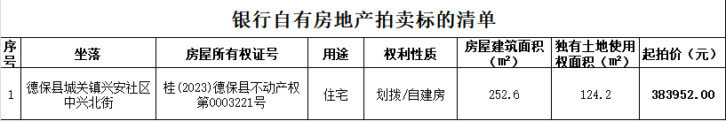 一、拍卖标的:中国农业发展银行德保县支行名下位于百色市德保县城关镇兴安社区中兴北街的1栋房地产,详见以下标的清单: