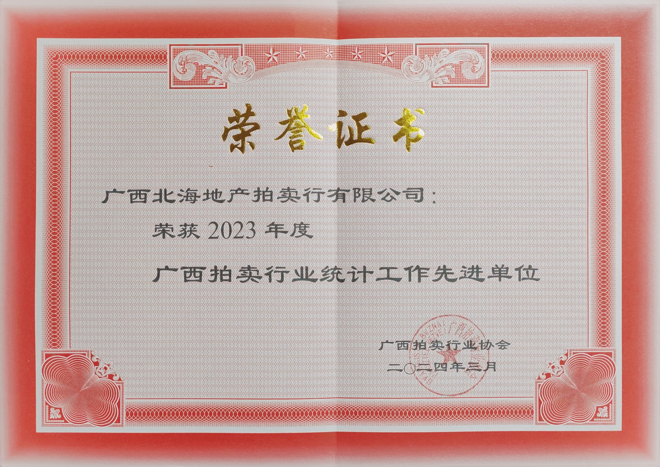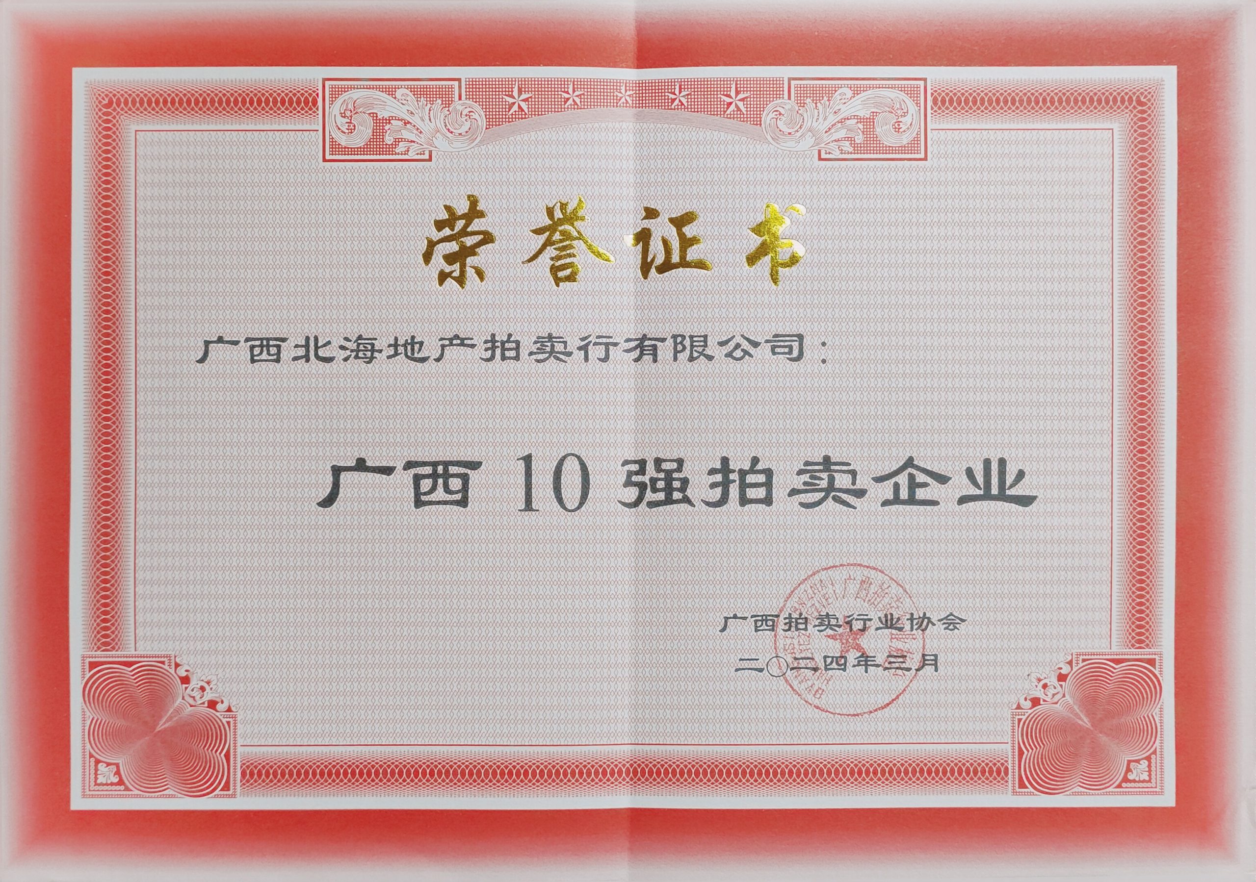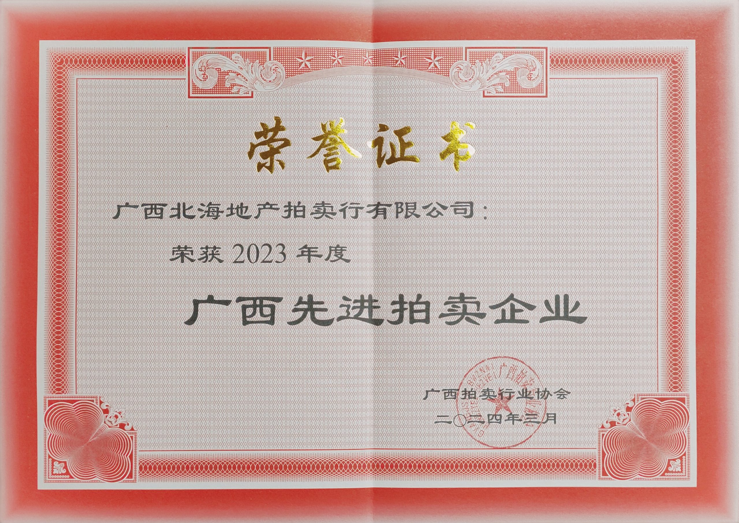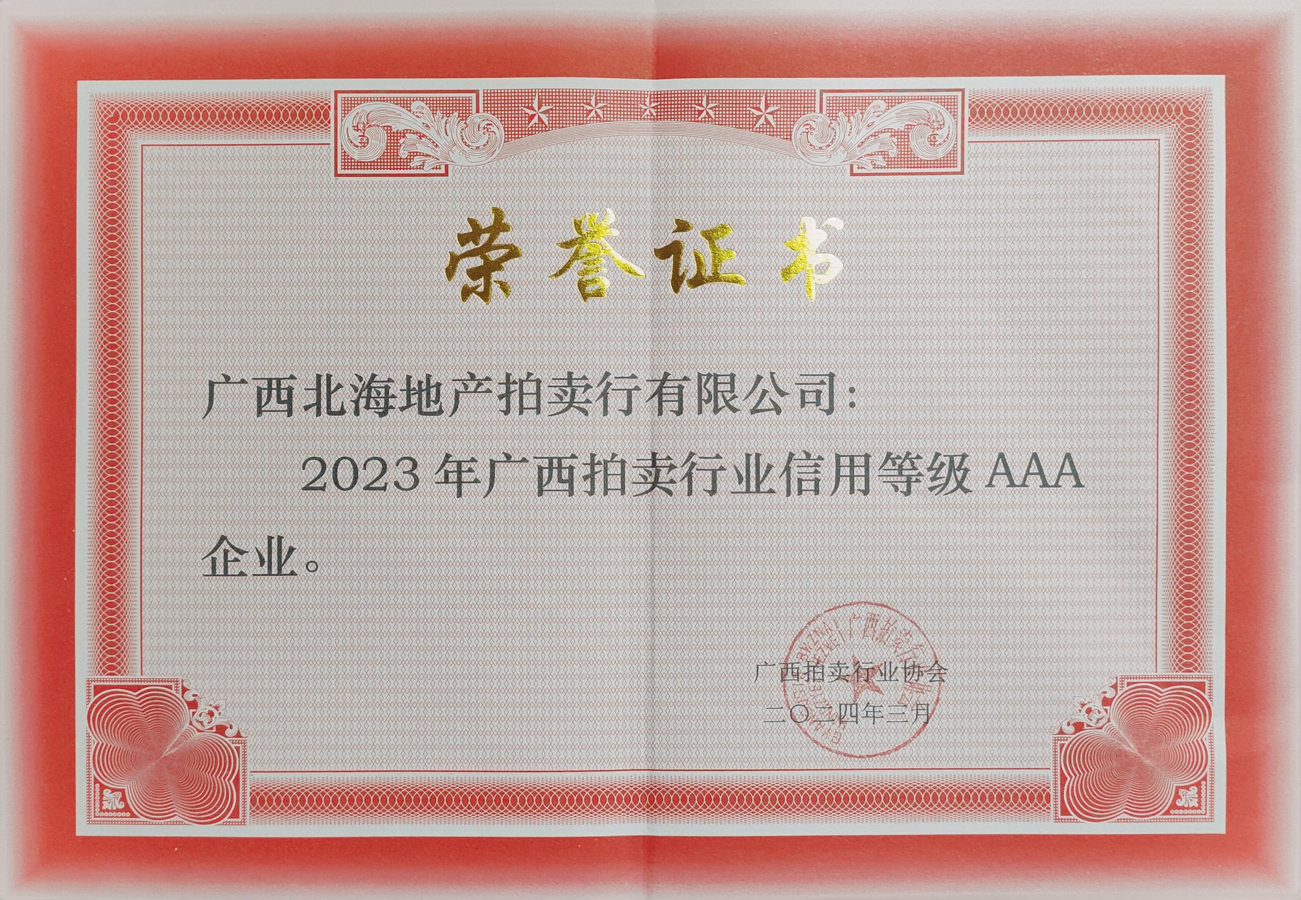 在成立25周年之际,我公司喜获“广西10强拍卖企业”、“广西拍卖行业信用等级AAA企业”、2023年“广西先进拍卖企业”“广西拍卖行业统计工作先进单位”称号,我公司杨建新拍卖师获“2023年优秀拍卖师”称号。荣誉既是肯定,更是一种责任。感谢广西拍协和社会各界对我公司工作的肯定,能获此殊荣离不开所有客户的信任和支持。我们将以更加饱满的热情和更加务实的作风,不断努力,不忘初心,砥砺前行,再创佳绩!
