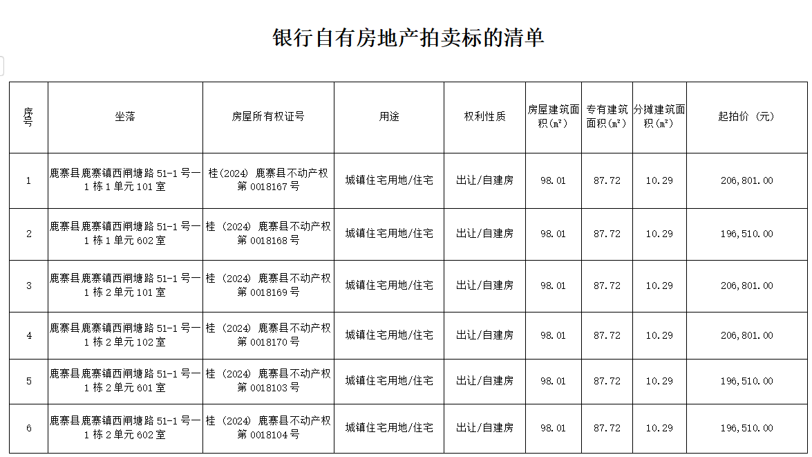一、拍卖标的:柳州市鹿寨县鹿寨镇西闸塘路中国农业发展银行鹿寨县支行拥有的共6套房产,按套分别拍卖,详见以下标的清单,竞买保证金:5万元/套。