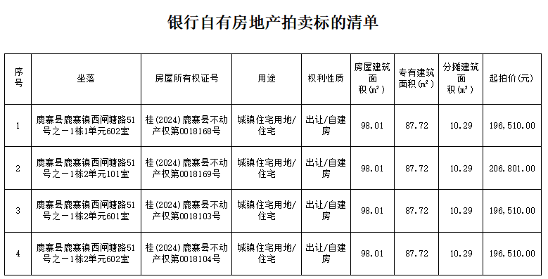 一、拍卖标的:柳州市鹿寨县鹿寨镇西闸塘路中国农业发展银行鹿寨县支行拥有的共4套房产,按套分别拍卖,详见以下标的清单,竞买保证金:5万元/套。