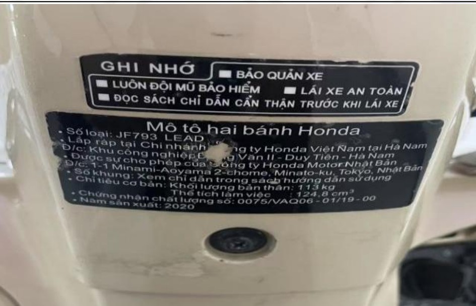 | 1 | 本田125cc摩托车 | 米白 | JF89E-0162646 | RLHJF7939LZ021423 | 2020年 | 越南 | 3000 |