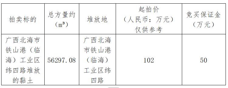 广西北海市铁山港(临海)工业区纬四路堆放的黏土56297.08立方米拍卖公告